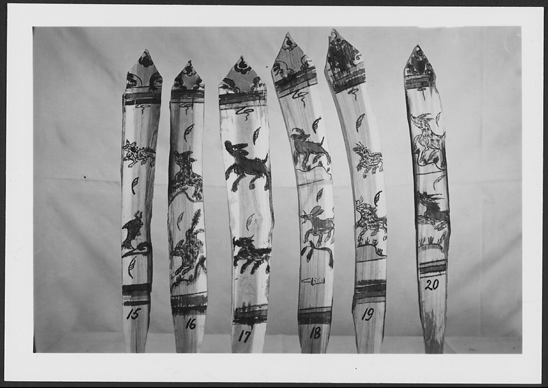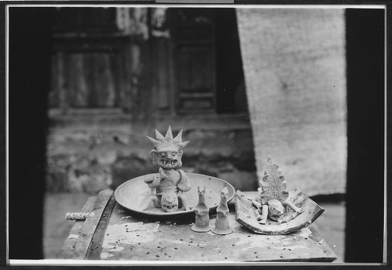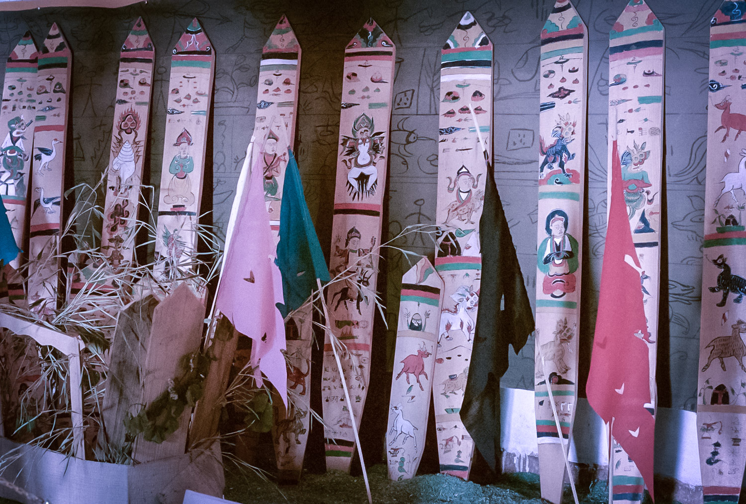 For rituals, they generally donned a five-lobed crown, called kho, with deities painted on each lobe. They employed thick, oblong cards with figures painted on them, called dzu, which they stuck upright in groups of seven, nine or 11 in bowls of rice placed in the middle of an altar. They also used wooden swords, called khobya, that were painted with pictographs. These they thrust into the ground next to streams to propitiate nagas, or into hillsides away from a funeral site. For some rites, dongba also made small figurines out of corn flour representing deities and demons.