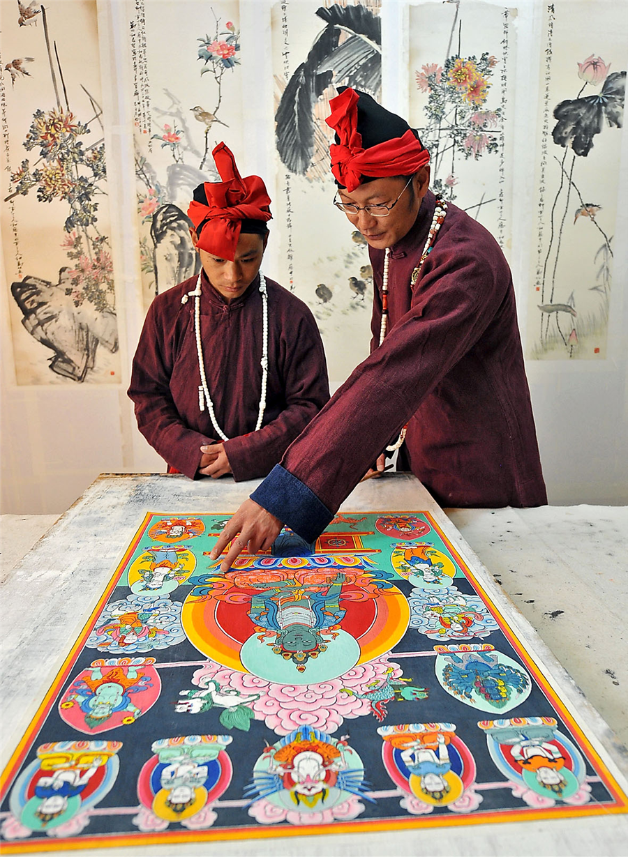 The introduction of Buddhism and Daoism influenced Naxi painting as well, which rapidly evolved from the simple, almost crude pictographs of the dongba manuscripts to the sophisticated wall murals that graced thirteen temples in the Dayan area. The overall balance of the murals and the orderly disposition of their figures, reflected a more Han-Chinese tradition. Subject matter could be Mahayana Buddhist or Daoist themes. The vivid coloring, emphasizing red, gold, black and silver, also reflected a strong Tibetan influence.