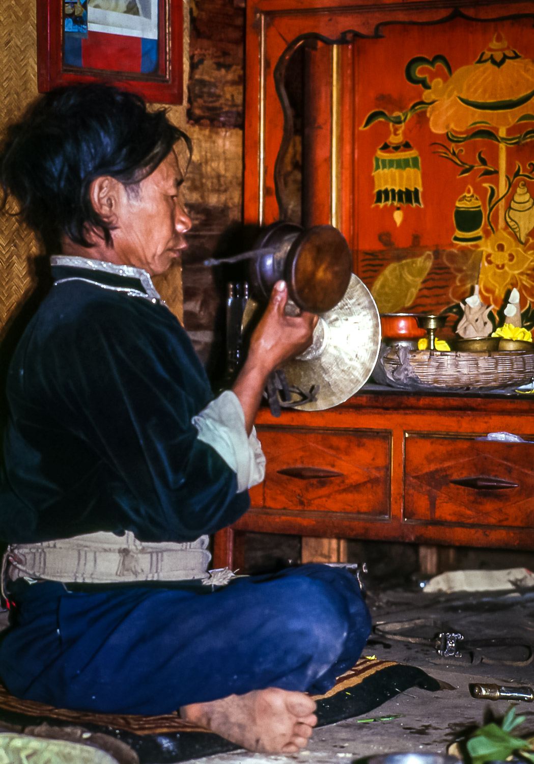 In the old days, village dongba customarily wore large-brimmed felted wool or bamboo hats. Otherwise they did not stand out among other villagers. They lived in the same kind of houses, and while patrons fed them on the occasion of a right or ceremony, dongba did not receive any salary. The only social advantage was the prestige accorded by being one.