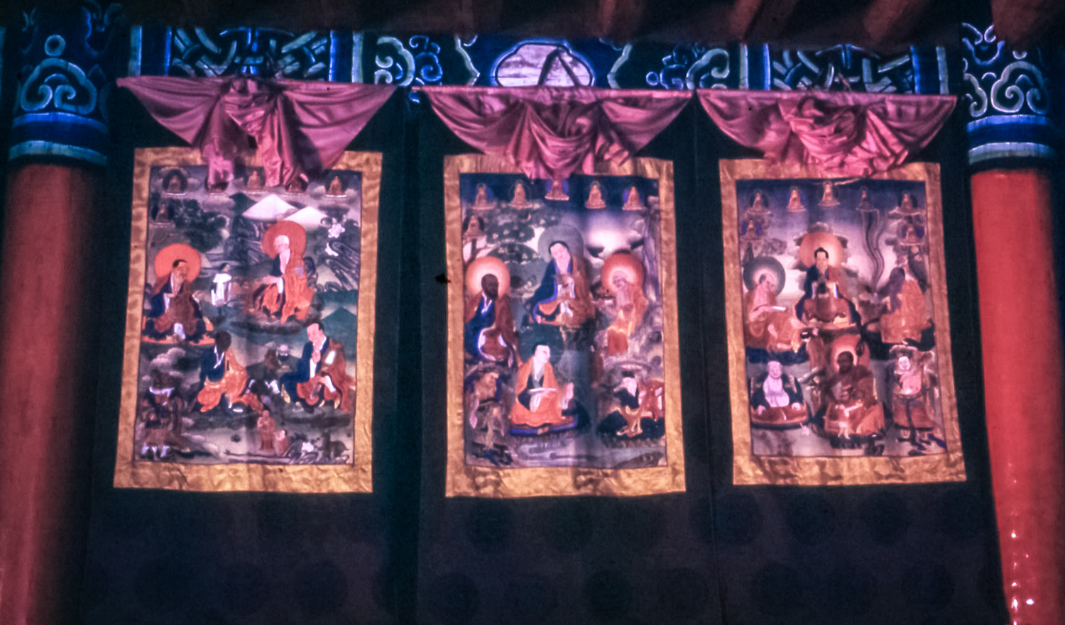 Puji Temple (普济寺), all but hidden in a forest five kilometers northwest of Dayan, was the third Karmapa lamasery, originally built in 1771. Two great crab-apple trees with twisted trunks stand in the main courtyard. Time, weather and neglect have reduced most of the exterior wall murals to mere traces and outlines. But the interior furnishings are in better shape. They feature painted religious scrolls — otherwise known as thangka — which are bright silk banners and various images of the Buddha and important Tibetan lamas.