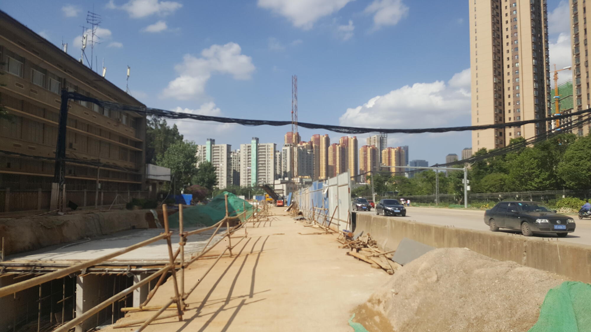 Rejuvenated by our taste of the Jinbaoshan life, we braved the plumes of pulverized concrete filling the air and crossed the as yet un-delineated chunk of road packed with all species of vehicles crossing at all angles. Our goal was to reach a forested hill that Baidu Maps told us was Mianshan Forest Park. However, the neighboring construction had formed a deep chasm populated by slabs of concrete, tangles of iron wire, and formerly yellow ofo bikes fossilized in gray dust, thereby halting any attempts at ingress.