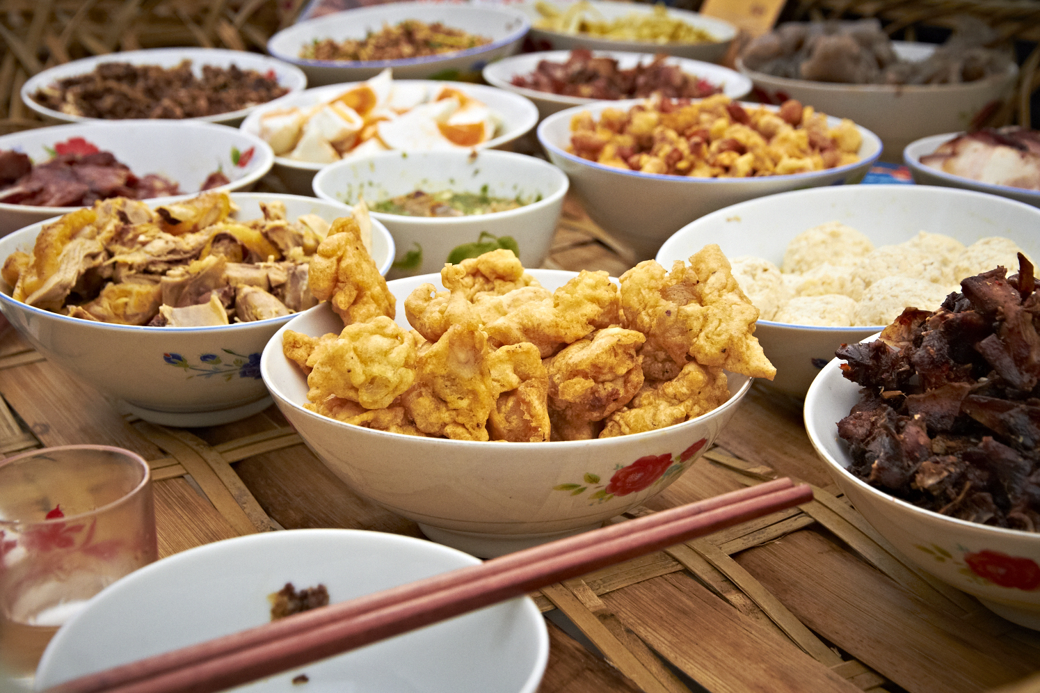 The table is full of bowls — smoked meat, wild bamboo, spicy cucumber and marinated peanuts. We know we have to be quick, because somewhere further down the three-kilometer-long table, someone has initiated the day's first 'toasting wave'.