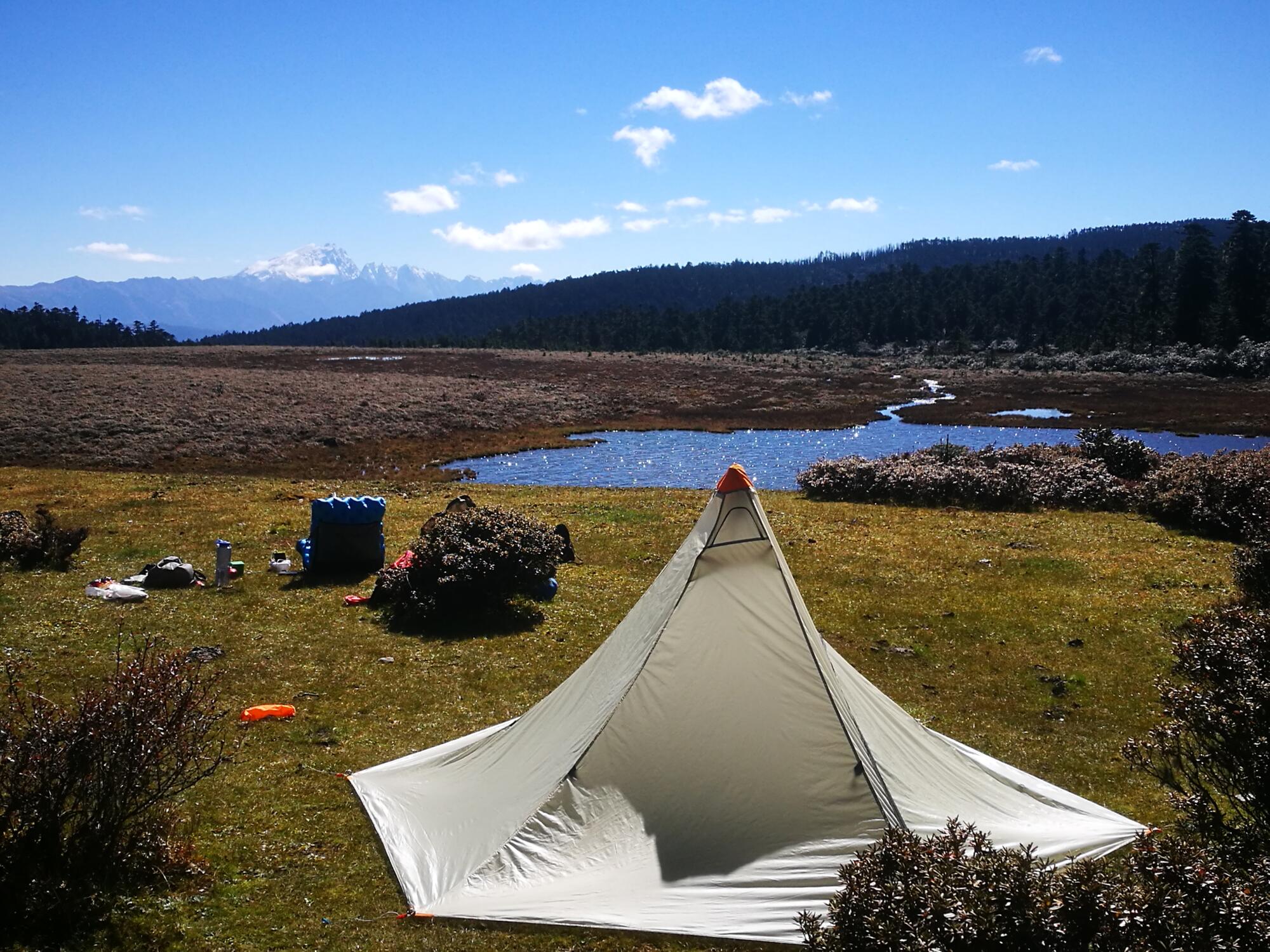I returned to the pass, savored the views for awhile, and headed back down in the direction from which I came. I arrived back in the main meadow in the late afternoon and pitched my tent in a section that was sheltered from the wind with fantastic views of Haba Snow Mountain (哈巴雪山) and the Jade Dragon Snow Mountain (玉龙雪山).