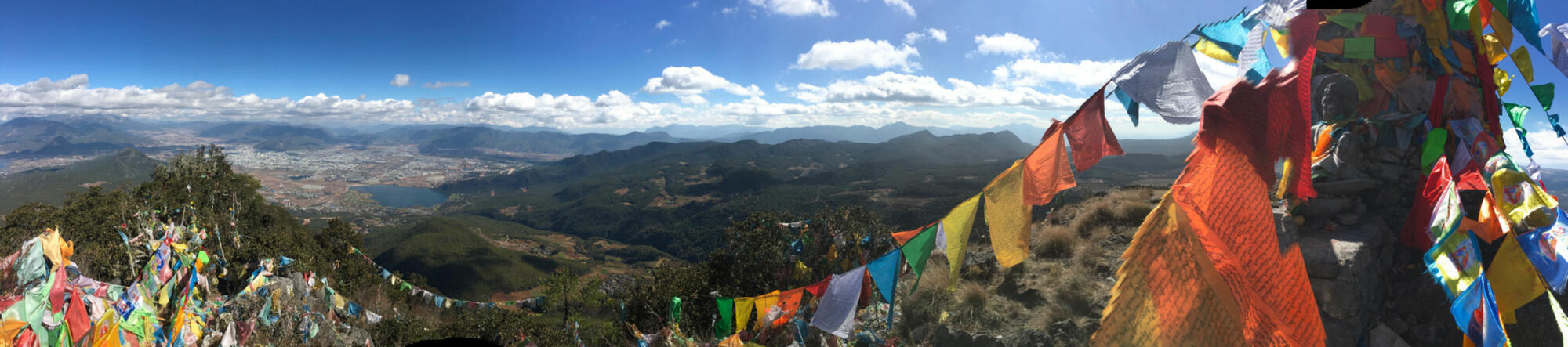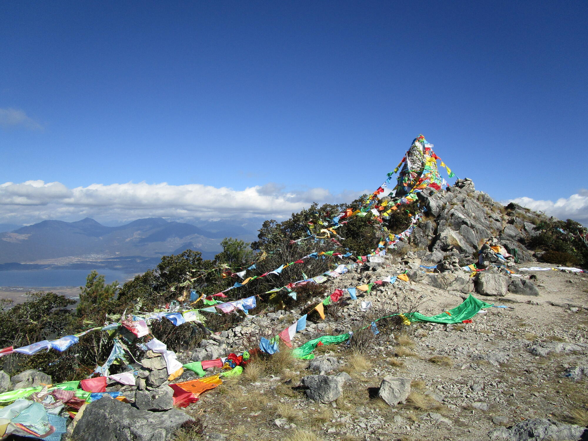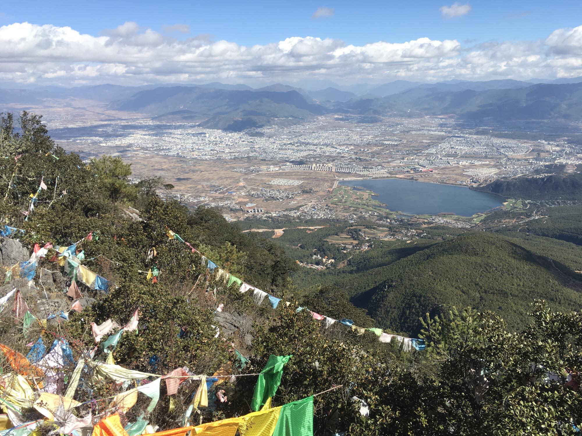 On the summit, hundreds of prayer flags fluttered in the wind, attached to a tall monument of stones with a Buddha deity sitting serenely to the side. The city of Lijiang spread across the valley to the east, while Lashi Lake and Jade Dragon Snow Mountain appeared in the north. Looking straight down, or seemingly so, I glimpsed the golden roofs of Wenfeng Temple where I had started. The new Lijiang-Shangrila railroad emerged from underground passageways. Mountains ringed the horizon. A rewarding panorama all the way around.