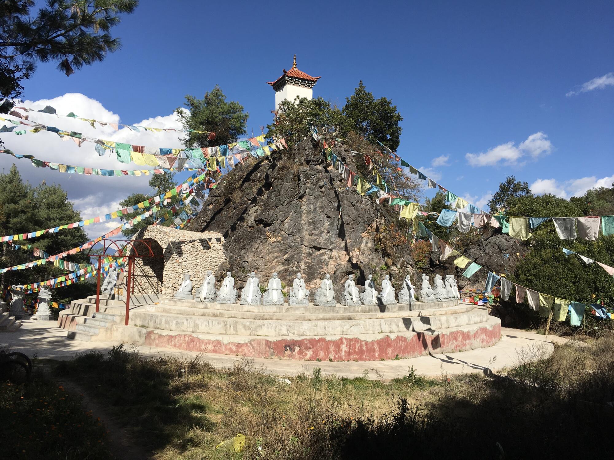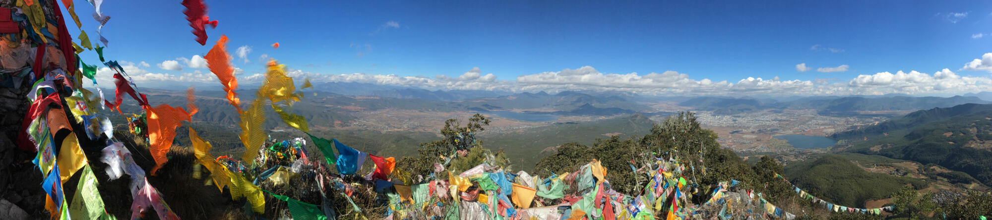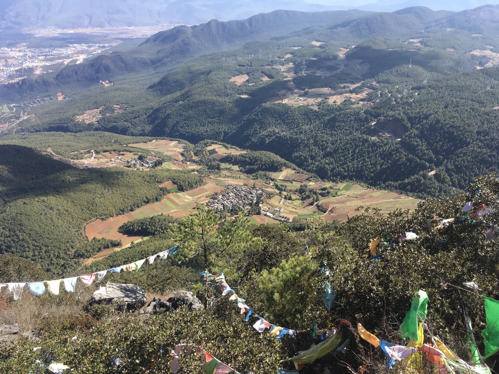 On the summit, hundreds of prayer flags fluttered in the wind, attached to a tall monument of stones with a Buddha deity sitting serenely to the side. The city of Lijiang spread across the valley to the east, while Lashi Lake and Jade Dragon Snow Mountain appeared in the north. Looking straight down, or seemingly so, I glimpsed the golden roofs of Wenfeng Temple where I had started. The new Lijiang-Shangrila railroad emerged from underground passageways. Mountains ringed the horizon. A rewarding panorama all the way around.