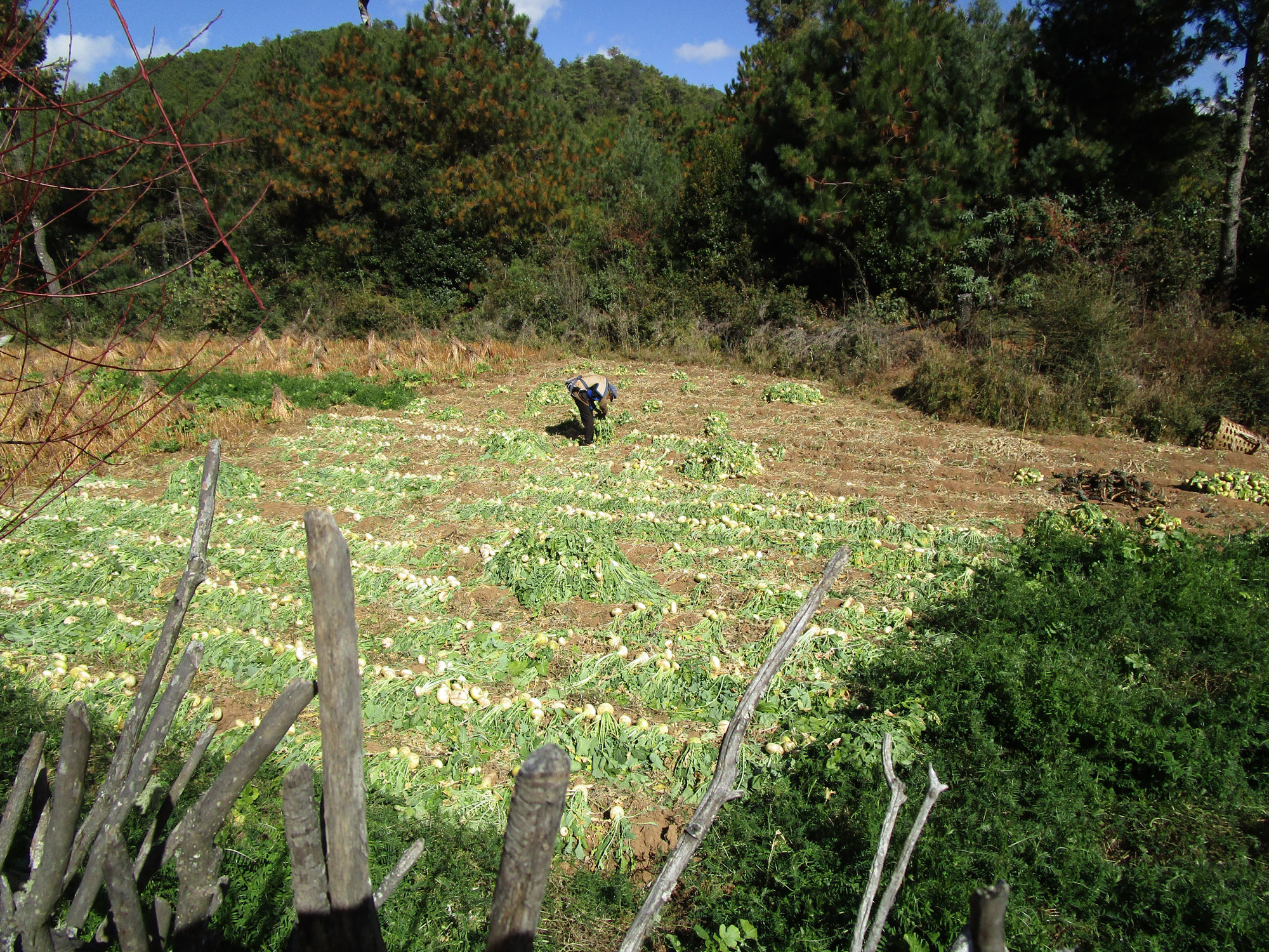 Along the way I passed fields cultivated by residents of nearby Wenping Village (文平村), an agricultural hamlet of two dozen homes. Harvest season had arrived and the reapers offered me a vegetable that looked like a turnip. They called it ma-chee. Back in Lijiang, the cook at my guest house recognized it as manjing (蔓菁) and served some up for the evening meal. Food from the trail, a satisfying way to end the day!