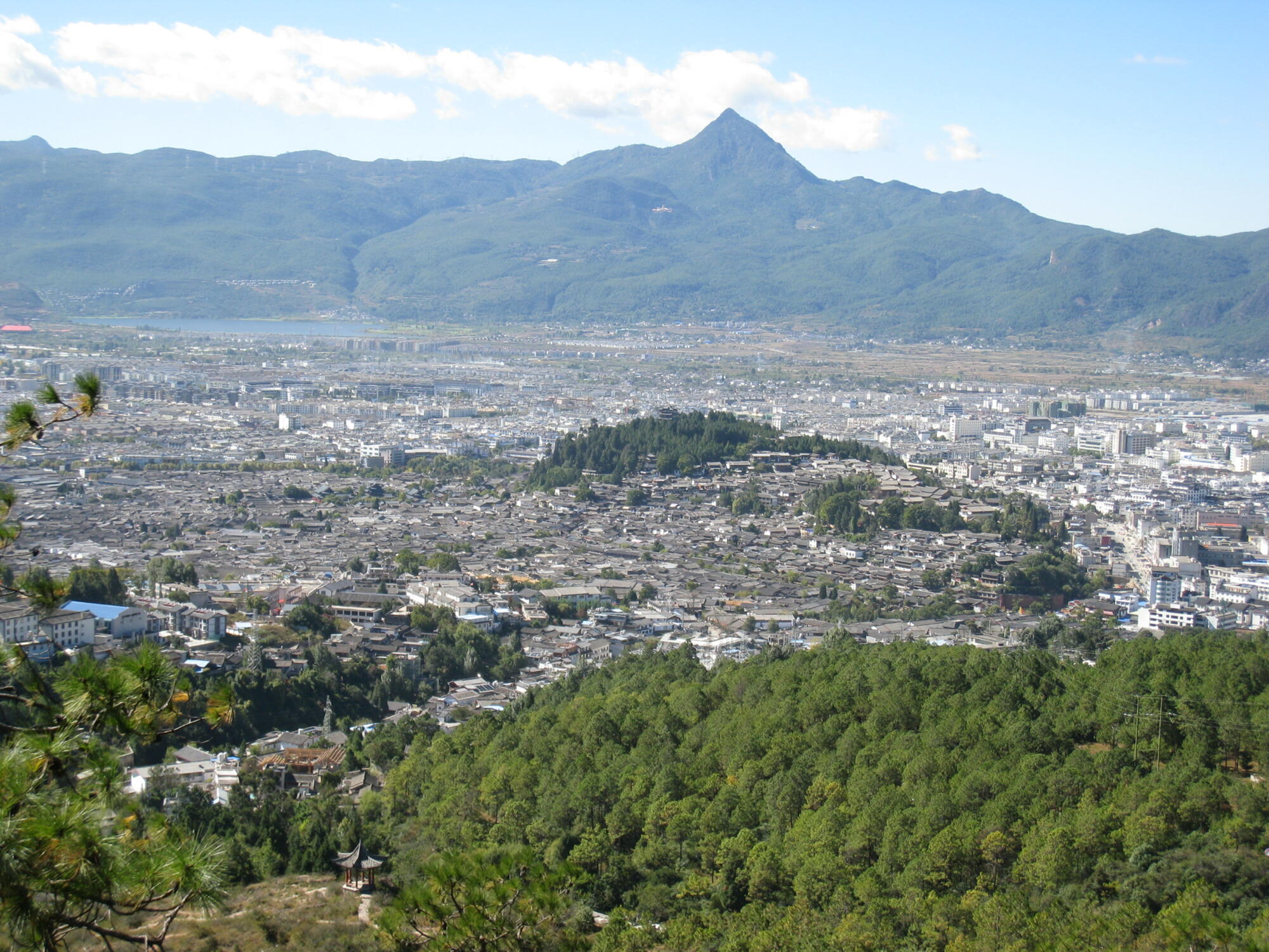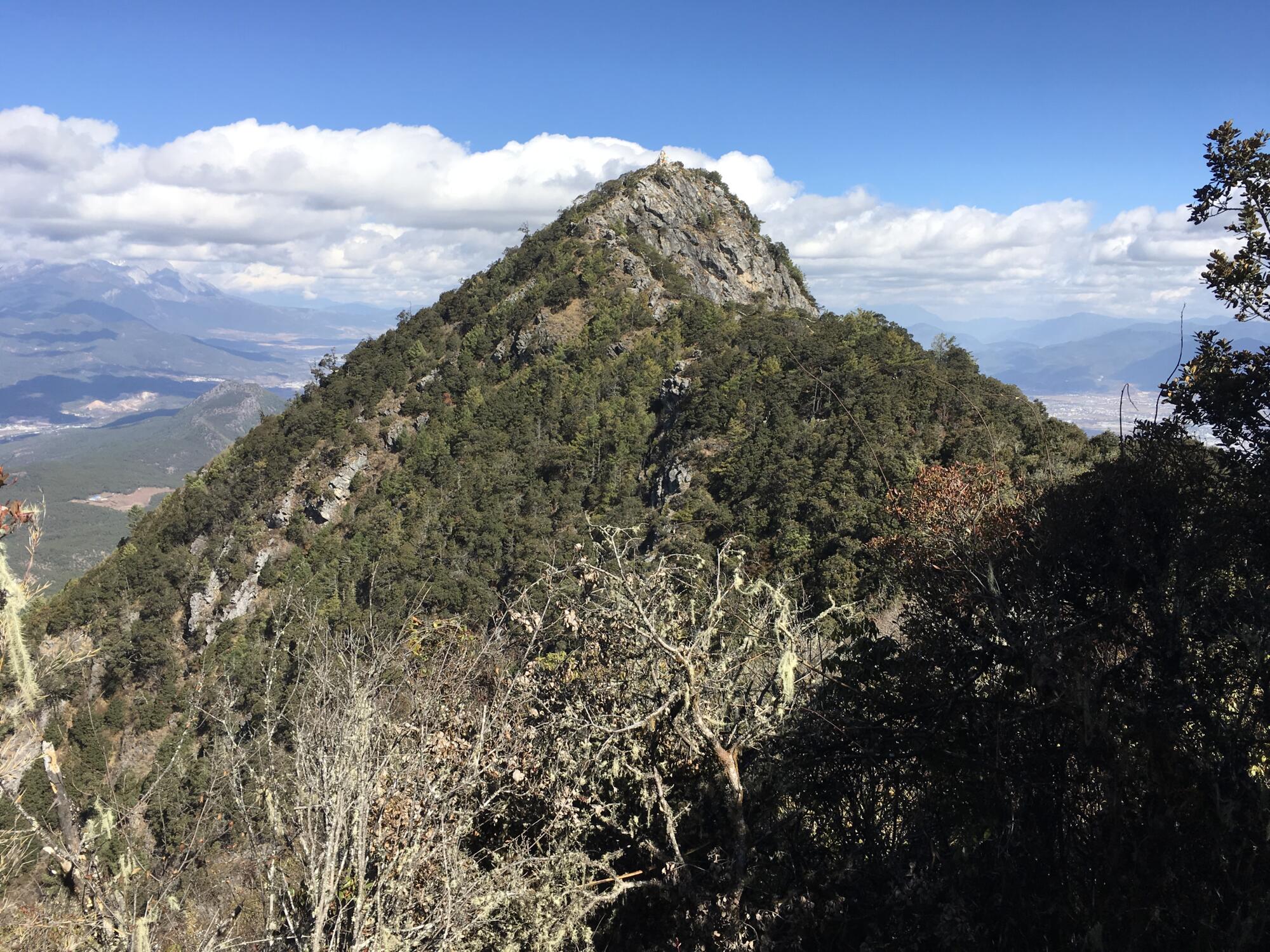 On my first visit to Lijiang, Wenbi Mountain (文笔山) caught my eye, and justly so. Its distinctive triangular form rises prominently on the southwest horizon. Wenfeng Temple (文峰寺), a Tibetan Buddhist monastery on the lower slope, adds to the allure. When the light is just so, the temple is readily visible from many streets in the city.