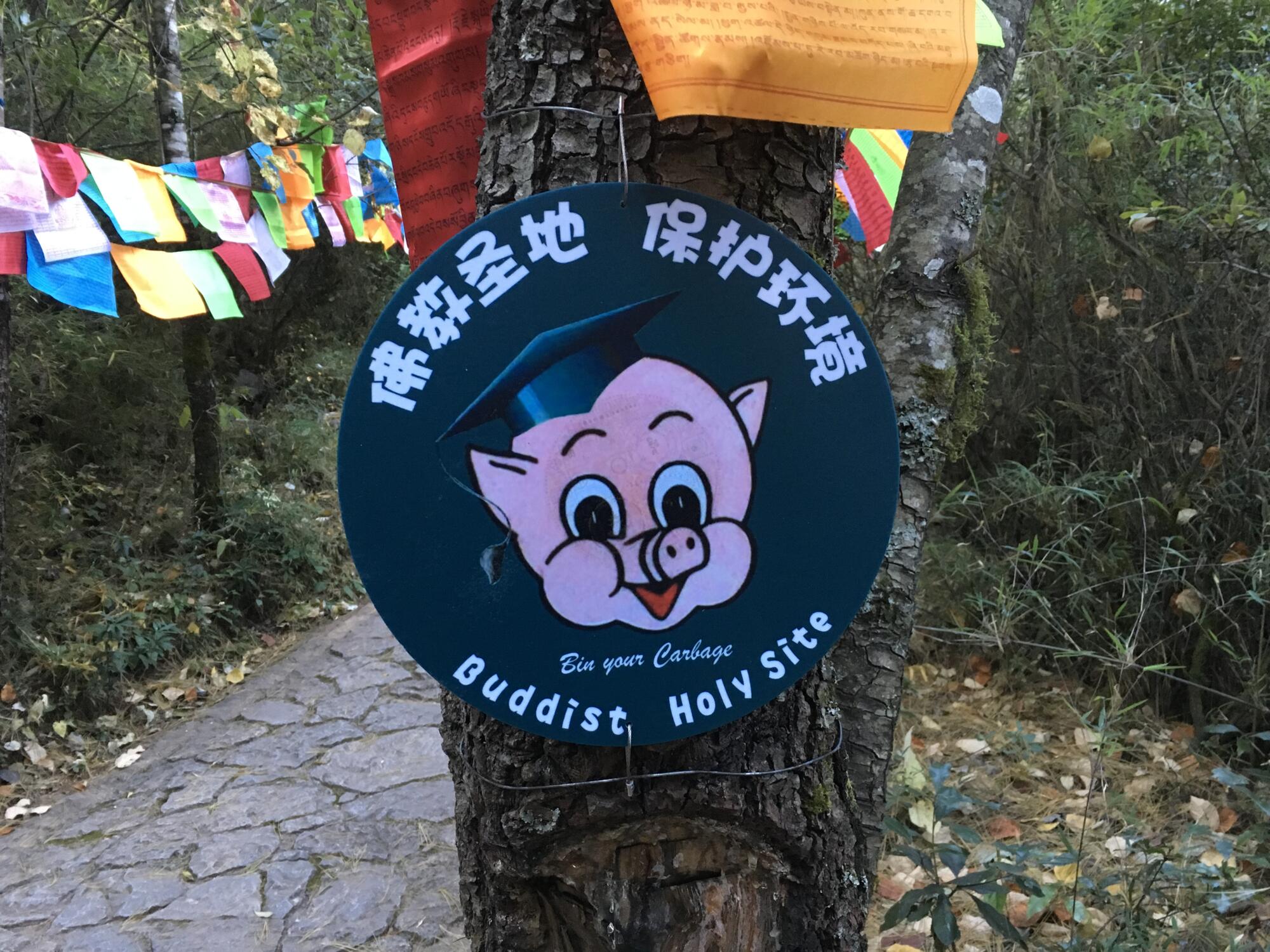 Pass a small hut and continue on a dirt path lined with Tibetan prayer flags. The trail gains little elevation at first, then climbs steeply to a dirt road. Local vehicles and residents ply this road. Make special note of this intersection for the descent.