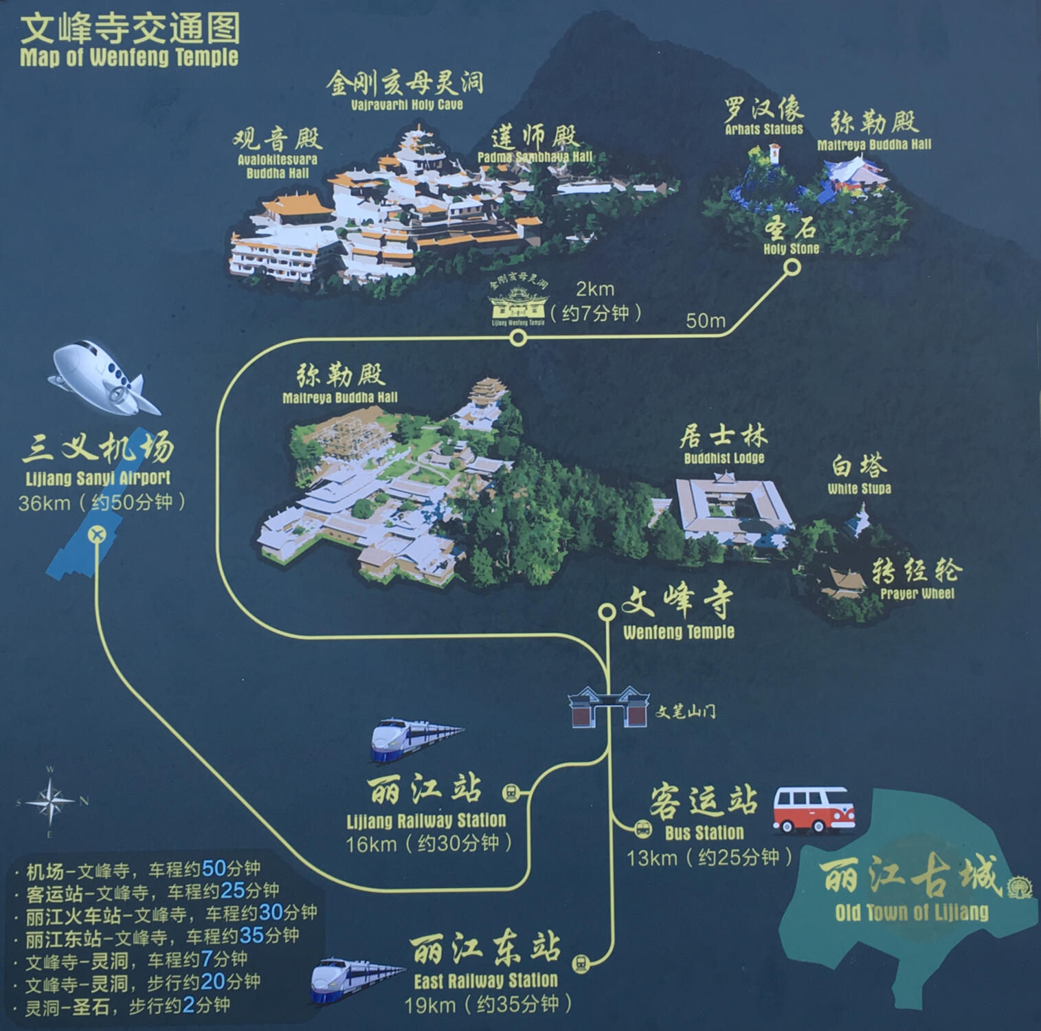 By bus: There is no bus service to Wenfeng Temple. Bus 19 reaches closest and can be boarded on Changshui Road (长水路) on the south side of Lijiang Old Town. From the bus stop farthest outside the city, where the road makes a sharp turn, a two- to three-hour walk brings you to the temple's upper compound.