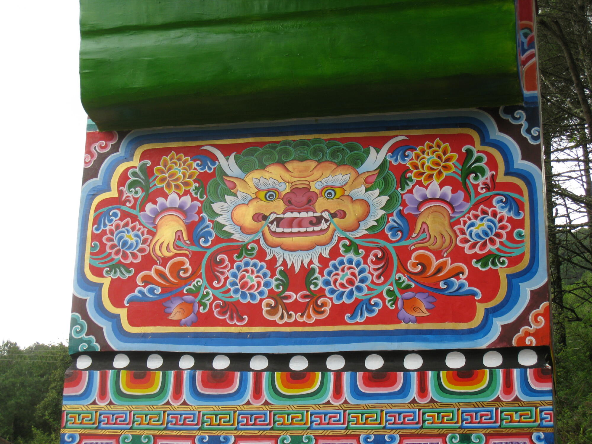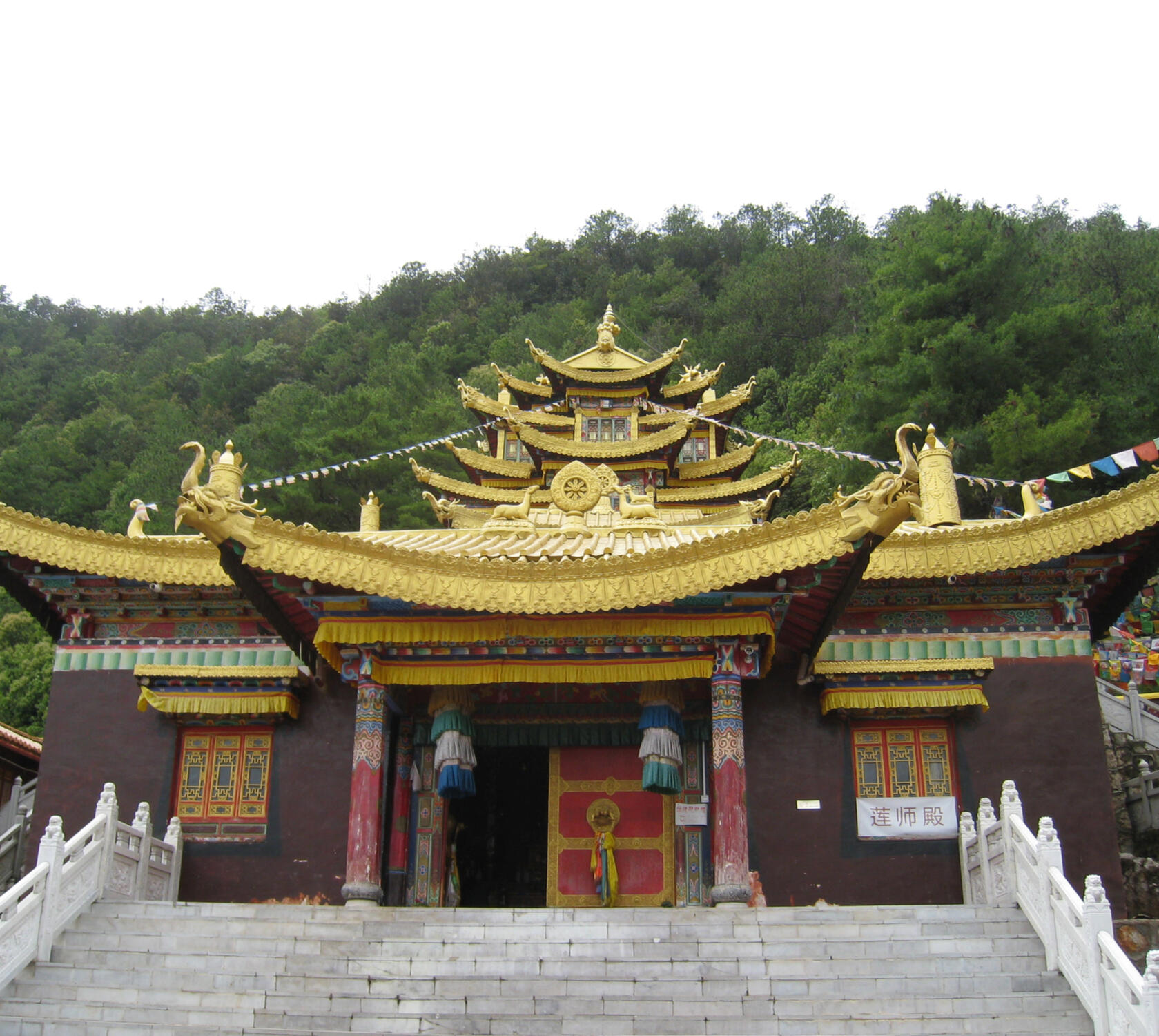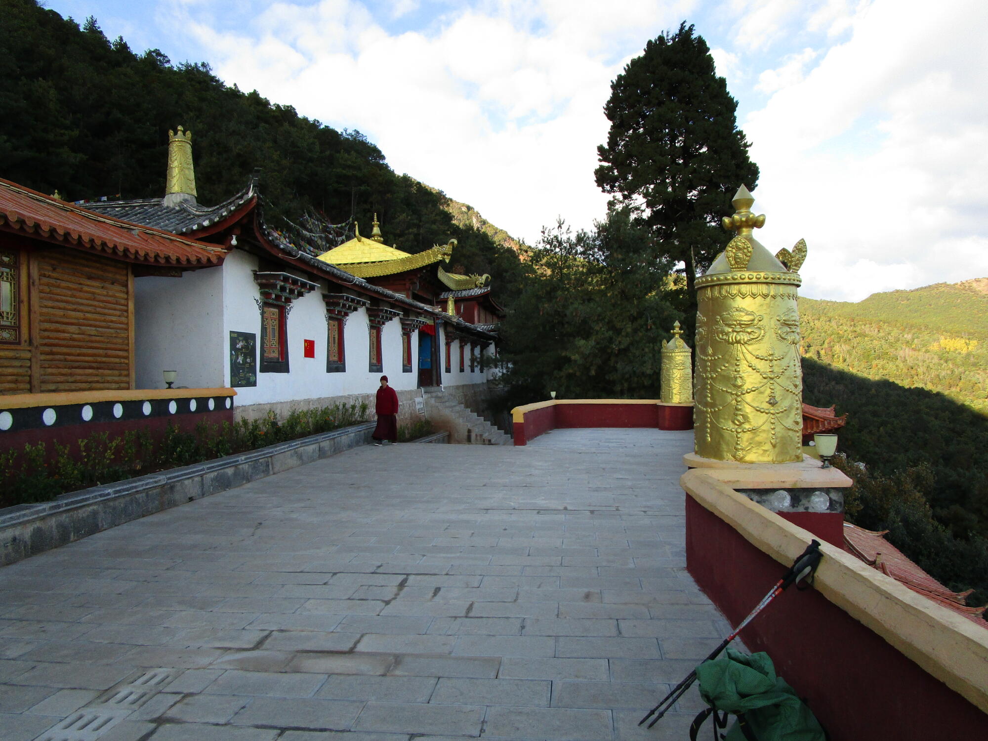 Continue straight ahead, descending steps that lead to a giant prayer wheel. The paved footpath skirts the compound in a westerly direction, gradually gaining elevation. After a few minutes arrive at a cluster of buildings, including residences for Buddhist nuns which are off limits to the public. Just beyond pass between the Arhats circle on the left, and Maitreya Buddha Hall on the right.