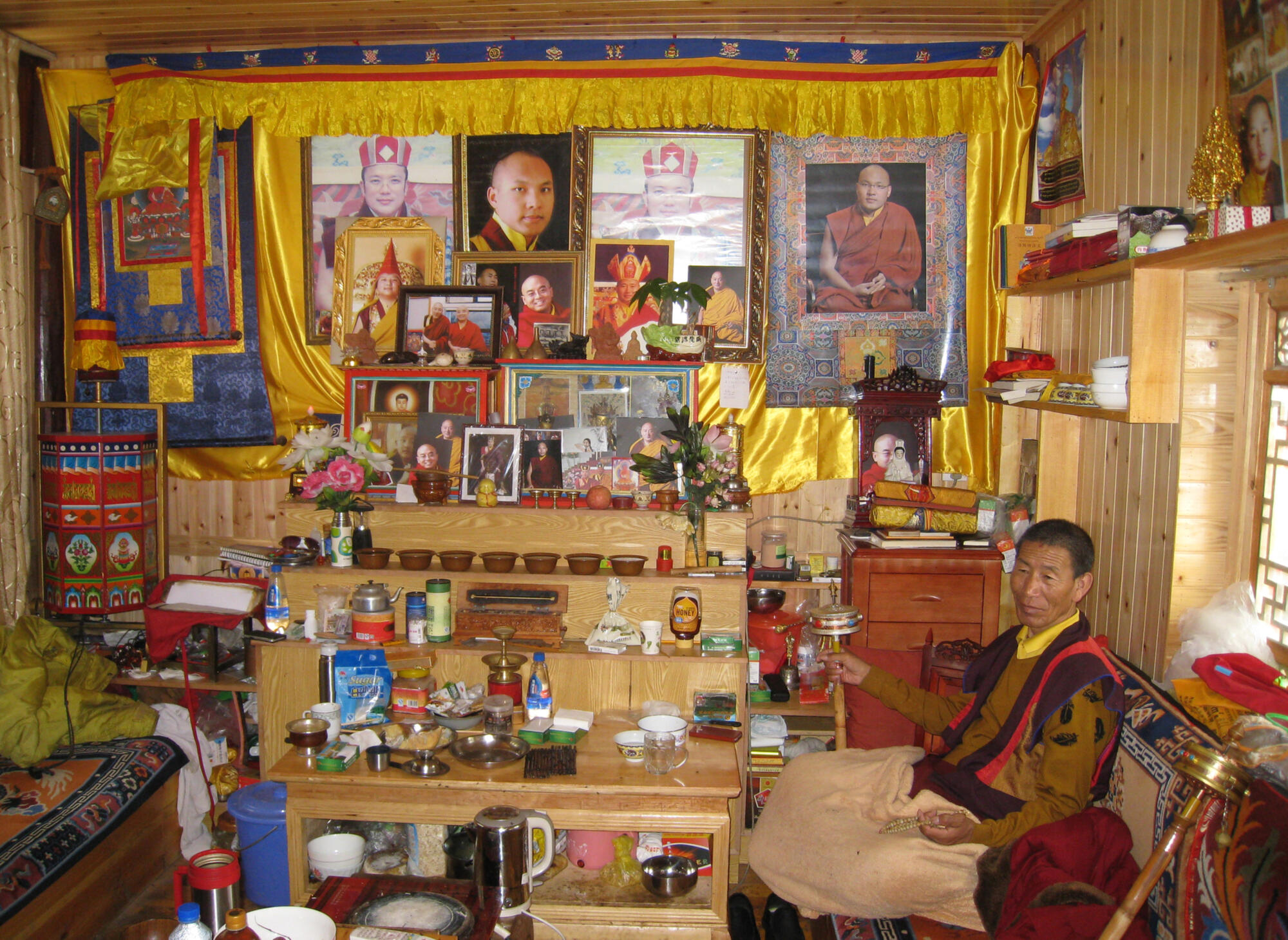 At the upper compound of Wenfeng Temple, I observed red-robed monks prostrating and assembling for rituals and ministrations. A lounge provided opportunity to rest and mingle. Photos of many monks lined the walls. Here I was offered fruit and Tibetan yak butter tea. The fruit I happily accepted.