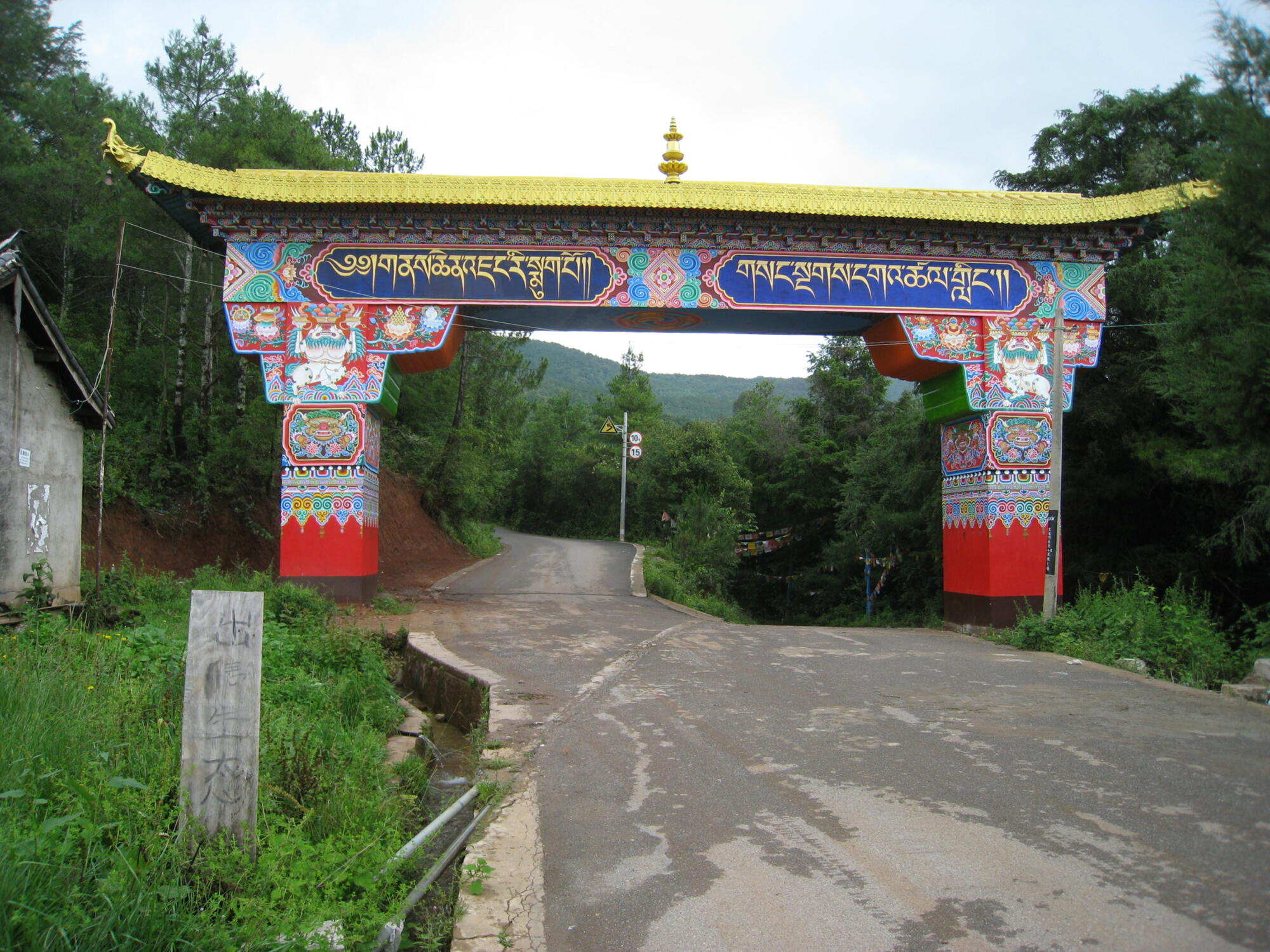 After seven kilometers on the road, pass through the colorful arch of Wenbi Mountain Gate (文笔山门) and take the right fork down to the lower compound. Ascend a paved path for less than a kilometer to reach the upper compound. From the parking lot there, hitchhiking back to town is a viable option.