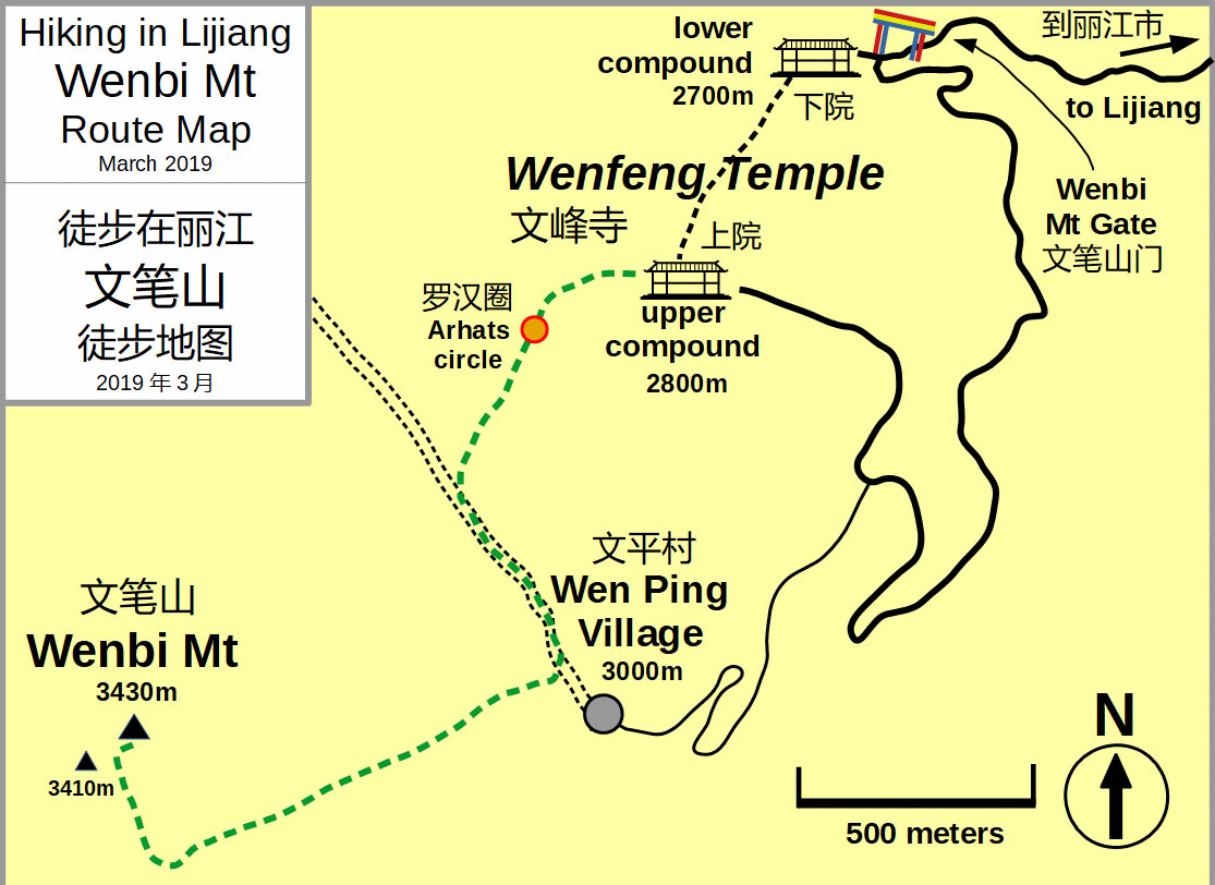 From the southeast shoulder there is a good view of the final ascent. The trail zig-zags up the slope and is marked by prayer flags, some are which are visible from below. The path turns right and descends slightly before switch-backing up the steep south face. The trail tops out on the ridge between two summits. Turn left for a short hike/bushwack to the south summit, with a fine view toward the north summit. Continue along the ridge to the north summit, the true peak of Wenbi Mountain, elevation 3,430 meters. From the upper compound of Wenfeng Temple to the summit — with an elevation gain of 650 meters — takes two hours. The entire hike, including the drive from Lijiang and return, takes 5-6 hours.