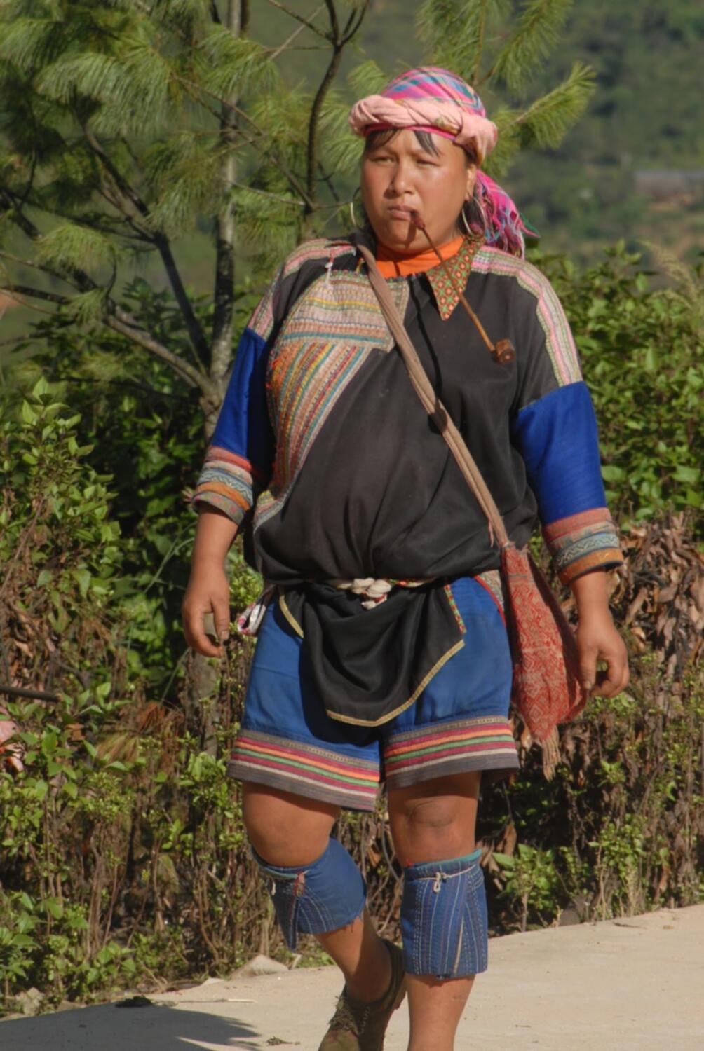 Shorts were similarly enhanced around the knees, the leg wrappers even more so. Like the coats, they revealed individual characteristics that were still recognizably the local Lahu style. They could be folded over at the top, studded with little silver discs or completely appliquéd. Most women tucked the front flap of their jackets into their waistbands to better show off the shorts and leg-wrappers and their embellishments more clearly. A few dressed without leg-wrappers at all.