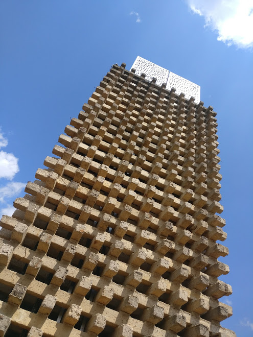 We enjoy the cool interior but sneak out halfway through the performance, back into the blazing sun. A bit further are more buildings in a similar style, looking like a hotel.