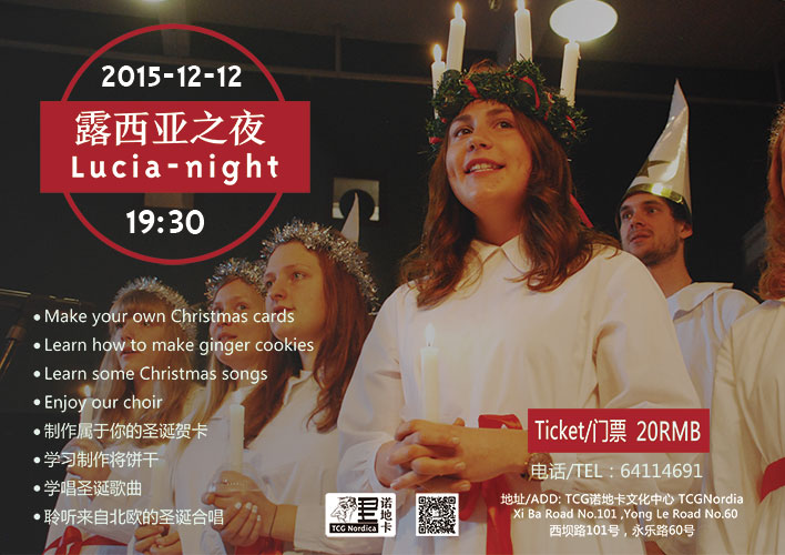 Lucia is a traditional holiday from Scandinavia,how Lucia should be celebrated and this is how Scandinavian Choir will perform it on TCG Nordica’s annual Lucia night. The choir will perform a variety of traditional Lucia songs to bring light and hope that Christmas soon will come.And we also prepare some activities for you such as Make your own Christmas cards;Lear how to make ginger cookies;Learn some Christmas songs.