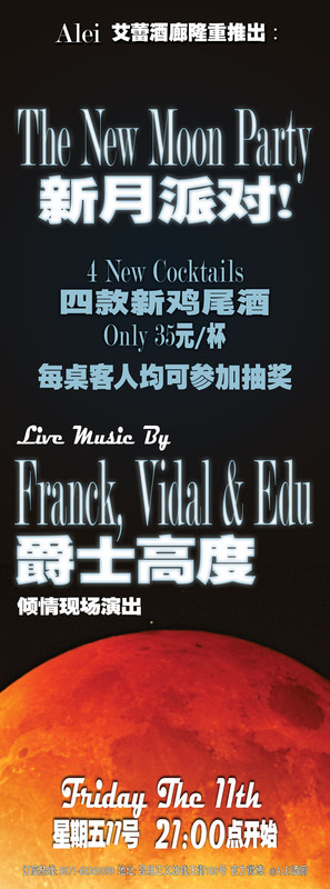 Join us this Friday the 11th for the new moon as we offer 4 new cocktails for 35元 a glass, including the XYZ (rum, gin & lemon juice), the Black Spark (blackcurrant liquor & sparkling wine), the Wire (whiskey, lemon juice, sugar & ginger ale) and the Screwdriver (vodka & orange juice).