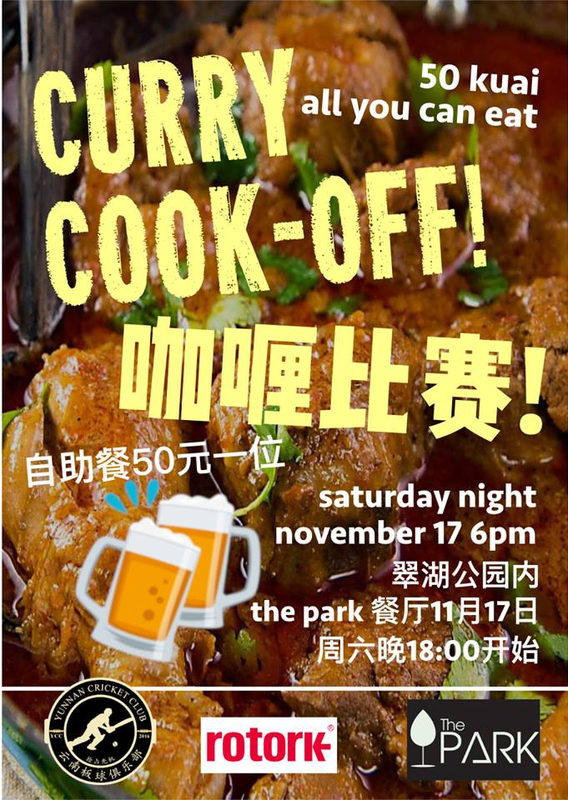 In order to add variety and interest to the Curry Nights, we’ve adapted the format to make it a cook-off contest with the title of Kunming Curry King/Queen going to the winner by popular vote. We have more than 14 chefs cooking their best curries for everyone at The Park on Saturday 17th November starting at 6pm.