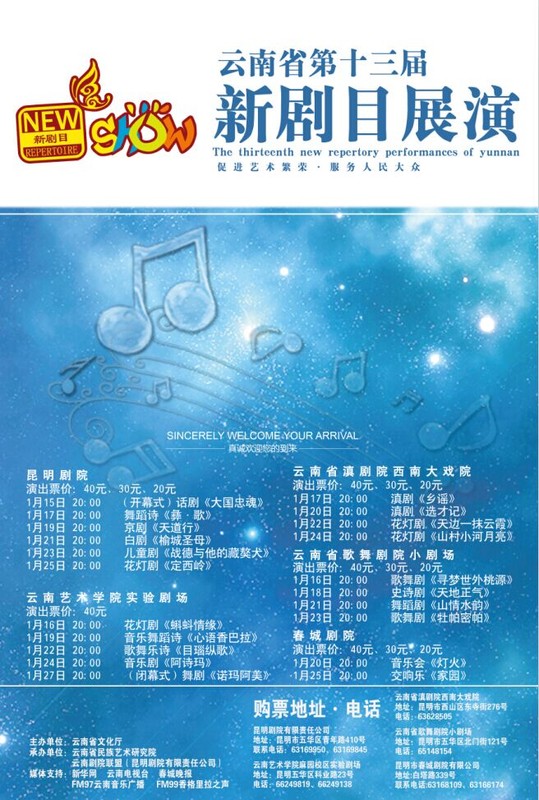 the thirteenth new repertory performances of yunnan, carefully selected. Collision events dating back to the last century begins, traditional folk lineage with the times, bringing together the province's original 21 units outstanding plays, showcasing the essence of the various categories of stagecraft, two time tempered, January 15, 2016 to January 27, each with their troupes will make the effort to become a New Year Spring viewers a gluttonous feast of stagecraft. Opera, drama Yunnan, lantern drama, drama, white drama, dance poetry, ballet, musicals, children's plays, symphonies, concerts will be staged turns, lit 16 years beginning. Show times and ticket advice Kunming Theater: 0871-63169950, or "barley Kunming Station" option seat tickets. The performances Huimin implement fare, the fare is set to 20/30/40 yuan.
