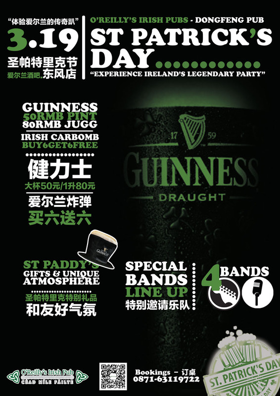 Also known as THE NIGHT OF THE YEAR, World Famous Saint Patrick's Day will be held at O'Reilly's Dongfeng this year.