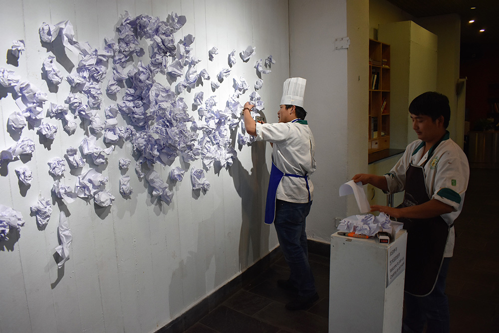 What happens when the artist lets the visitors take over and the process of creativity is not only the artist’s work? In the post-modern art, many artists invite people to cooperate in the artwork. That means the final result is unpredictable. We have to respect the result of what the participants choose of colors, form and design. I choose the materials: paper, ink, tread and tape. As artist I don’t know the way the installation will take form. I am just leading the creative process. When does the art start? When does it end?