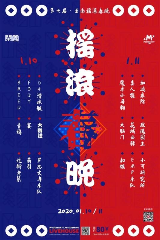 9 kunming bands on stage: Large Forehead, The Great Apes, 魔术小马驹, 玫瑰园主, EMP乐队, 花城西驿乐队, 加减乘除乐队, 小可研究所, 扣弦