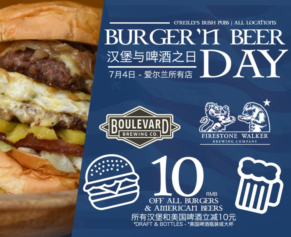 July 4 is 'MERICA DAY! And what is more American than BURGERS & BEERS? This Saturday, at all our locations, enjoy 10RMB OFF all our burgers and American beers (Firestone Walker & Boulevard Brewery)!