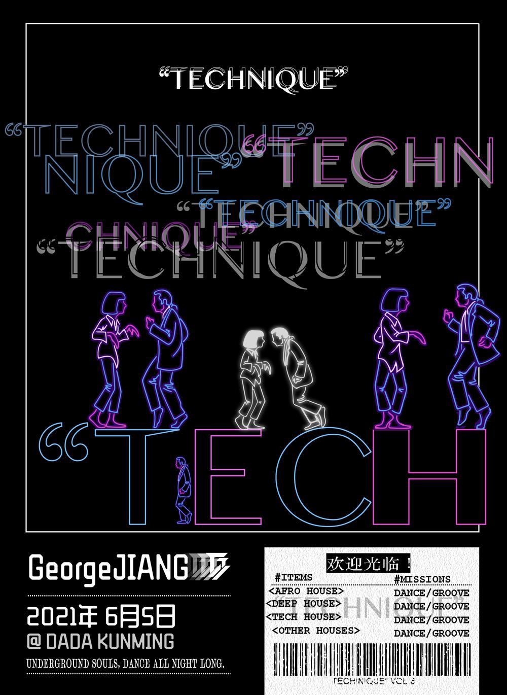 "TECHNIQUE" is an underground dance music event initiated by GeorgeJIANG. We are committed to promoting real underground culture. House music took the most important part of every "TECHNIQUE" event, which keeps our motivation and enthusiasm. Similarly, we also hope to provide people with a comfortable dancing environment and a precise music scene.