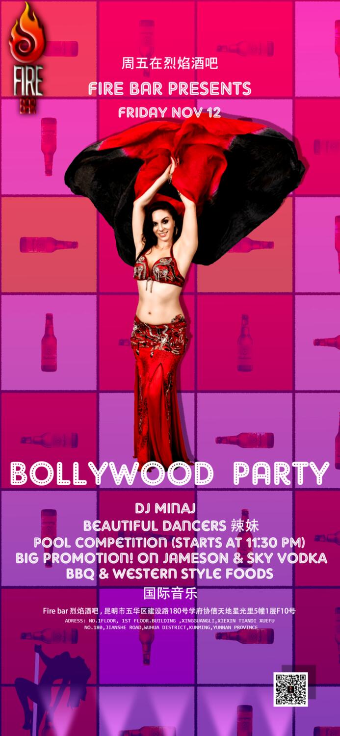 Friday night special in fire bar , Bollywood party with international music. with DJ Minaj , gogo dancer, party in every weekend in fire bar Kunming .